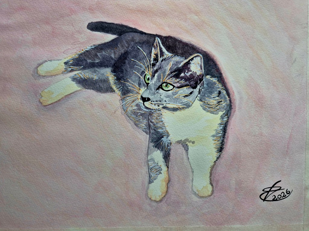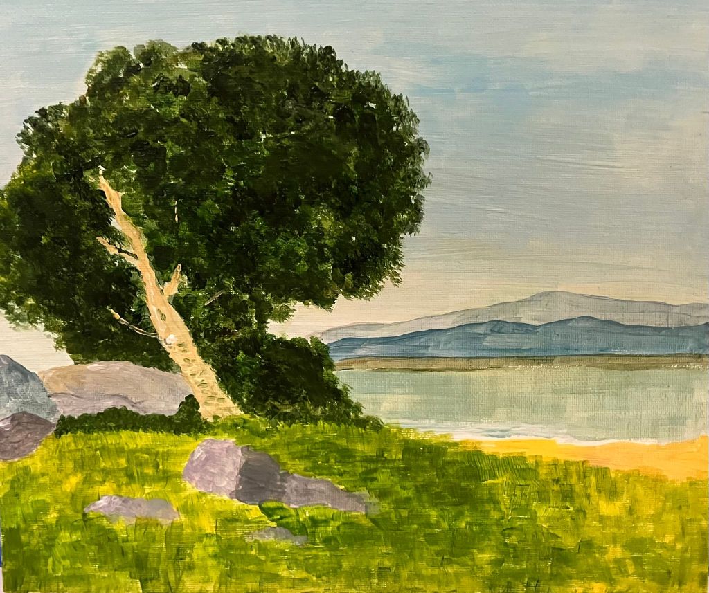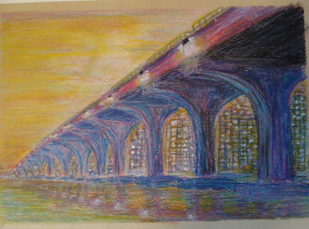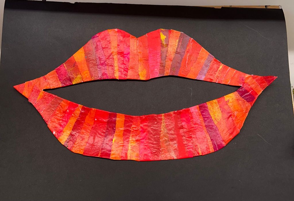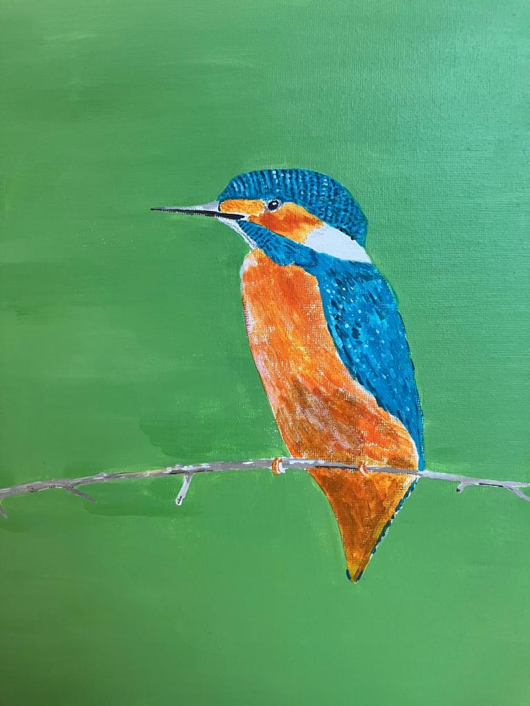 “The Obligatory Kingfisher”, Robin Stephens“A quick watercolour tree”, Robin Stephens“A bridge in perspective”, Bob Anderson (oil pastels)“Luxurious Lips”, Karen Dunleavey (jelly plates collage)“Tree on the shore”, Robin Stephens (acrylics)“Leaves”, Laura Tomei (gouache)“Grey beauty on pink floor”, Laura Tomei (watercolour and gouache)Batik practice at at workshop, Laura Tomei