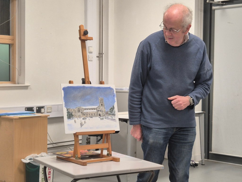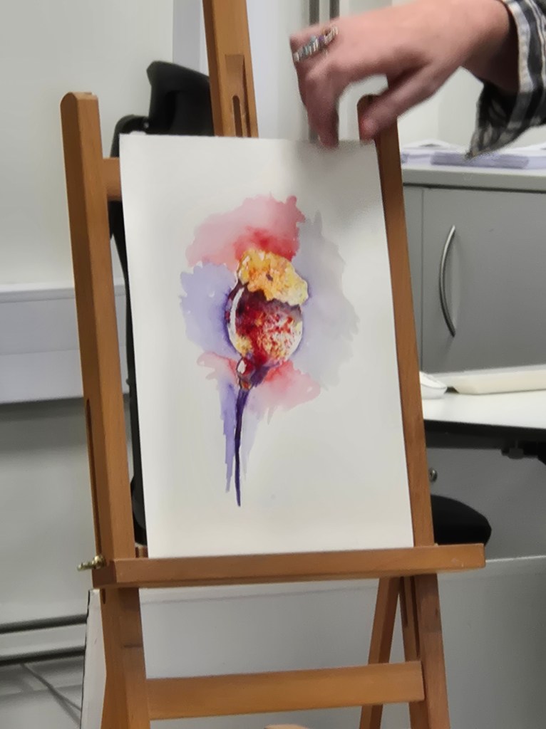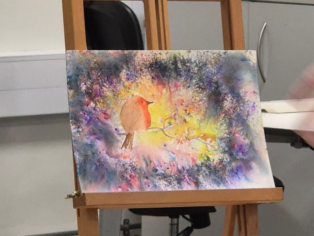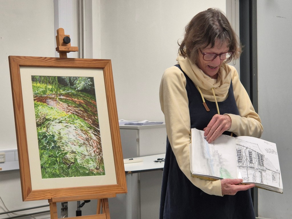 On the last meeting of the autumn term, we had our regular “Show & Tell” evening, along with pre-Christmas refreshments, wich plenty of delicious buffet food and drinks, including the very popular home made quiche by Ann-Marie! This is a normal activity at the end of each term. Each member shows what they have painted during the previous term weeks, explaining the inspiration and the techniques used. Other members comment accordingly, offering comments, encouragement and (always) compliments.