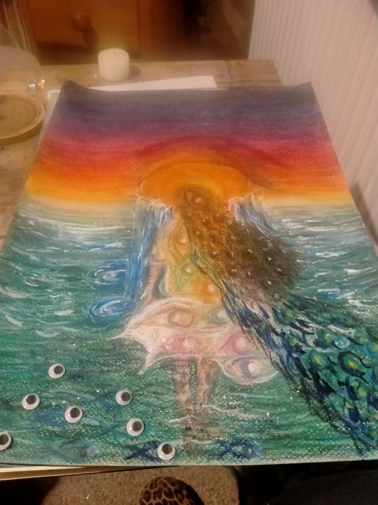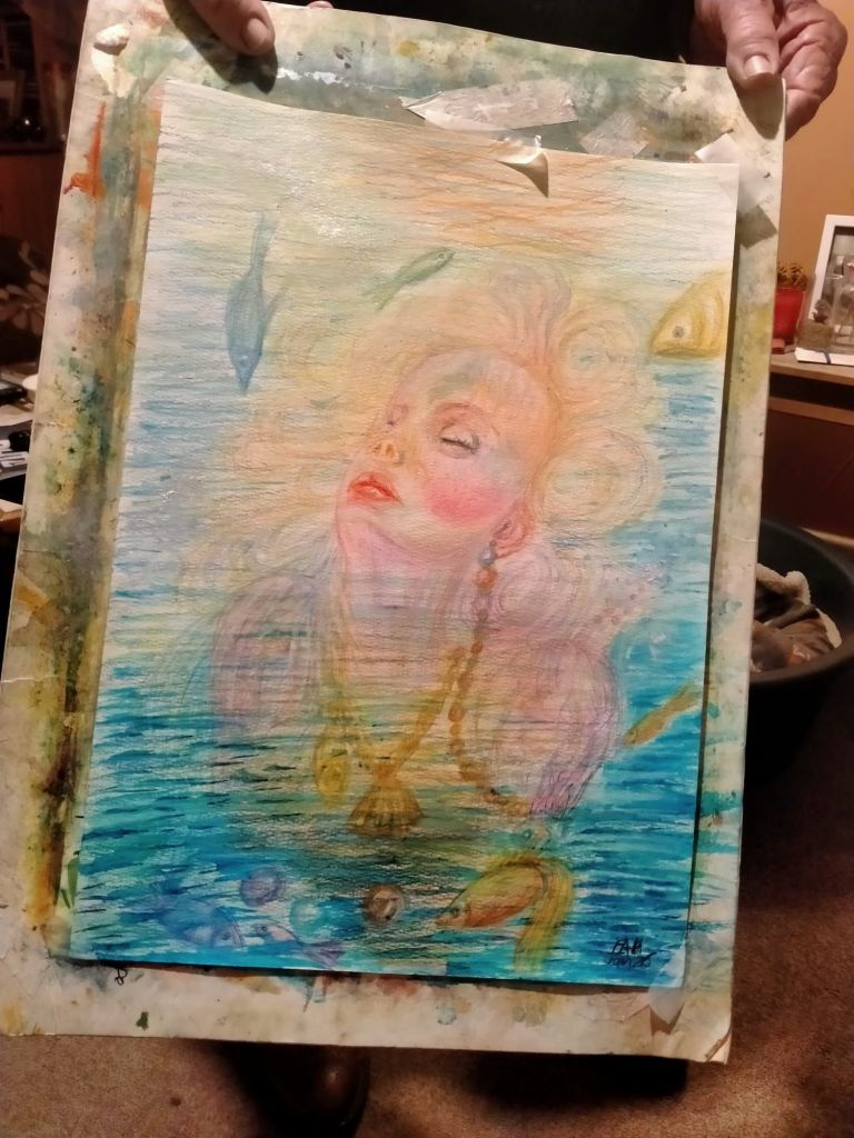 “Martin Åberg in Colours” Harriet Kimpton; free colour interpretation of the artist photograph (1934) by Jan de Meyere (1879=1950) (oil pastels)“After the Chaos”, Bob Anderson (acrylics)“In her element” Frances Heather (mixed media): “my mixed media mermaid. Started with watercolour pencil and then a little wash, soft pastel, oil pastel, brusho and acrylic ink.““If the whole body were the eye…” Frances Heather (mixed media)