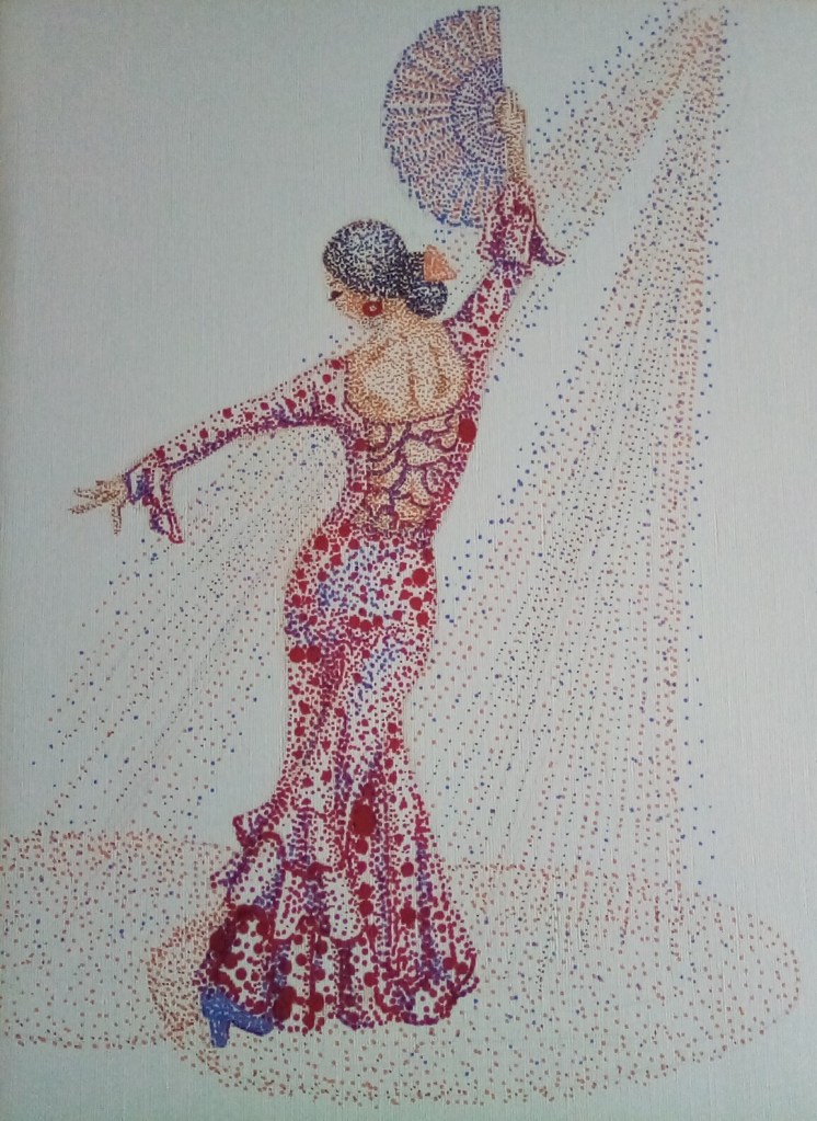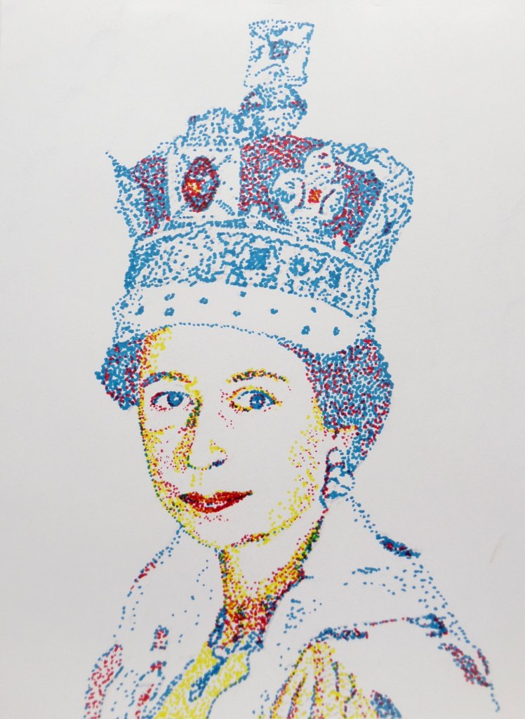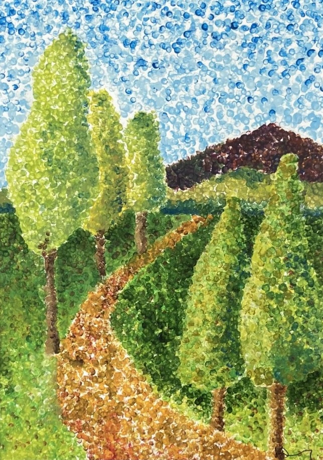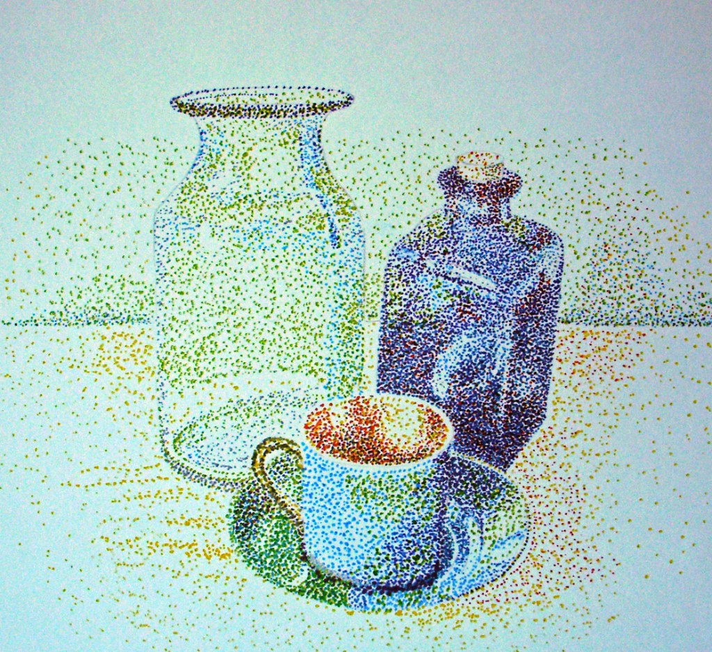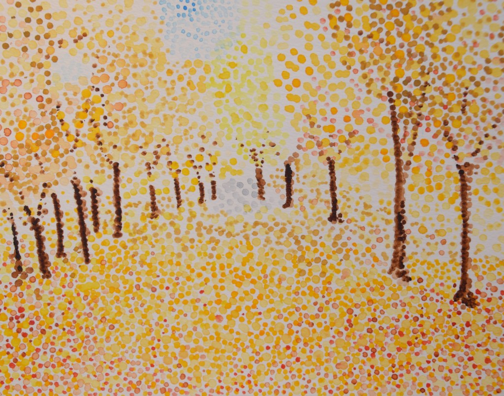 Pointillism is defined as ‘the practice of applying small strokes or dots of colour to a surface so that from a distance they visually blend together’.