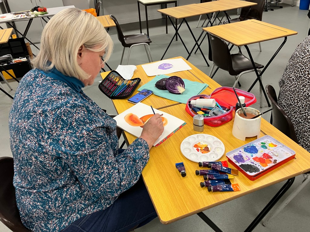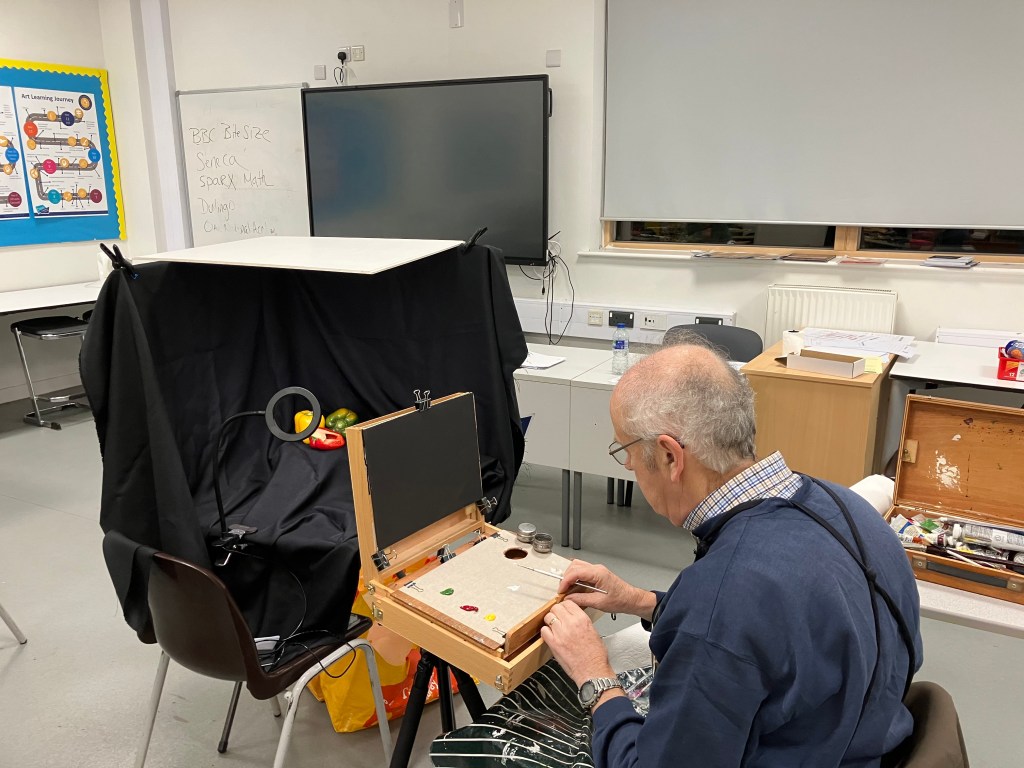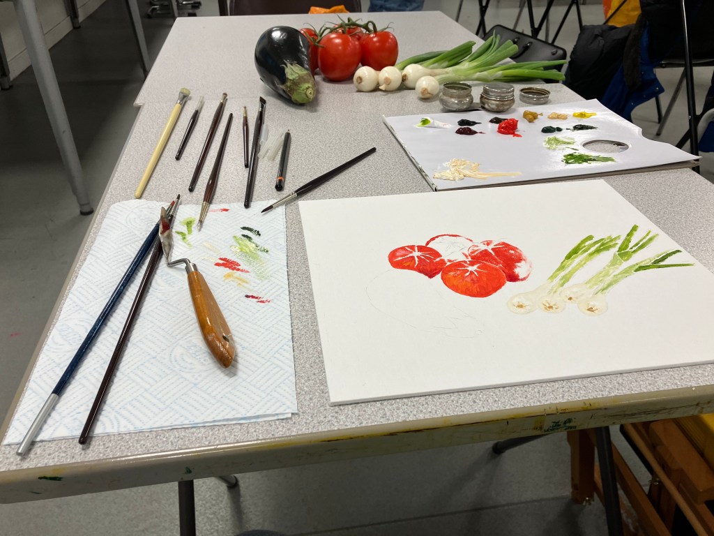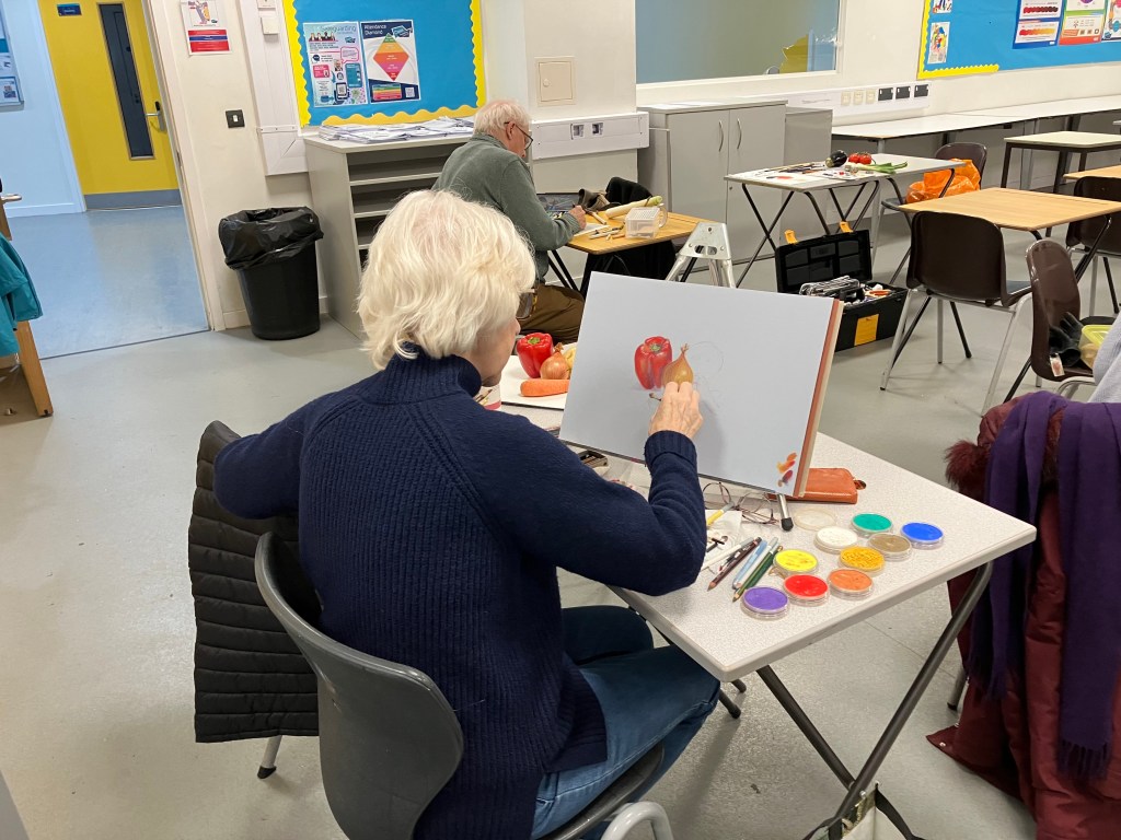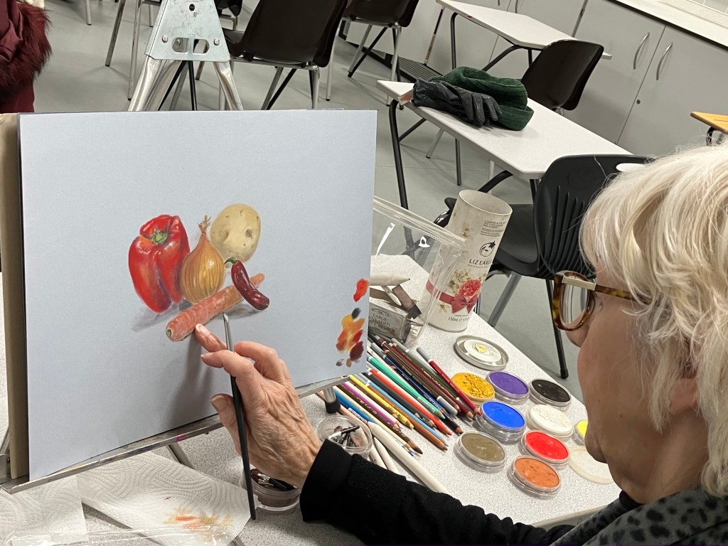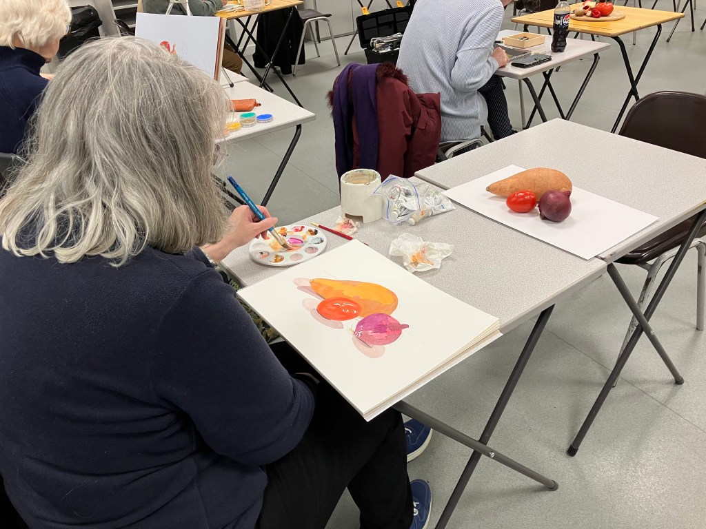 Following a video evening to study various techniques in a range of media, we had a group still life evening where we each bring in some interesting vegetables to paint.