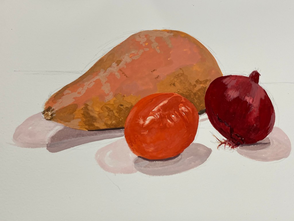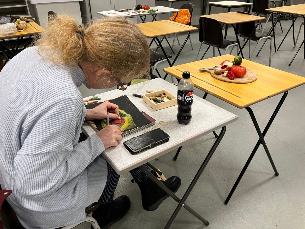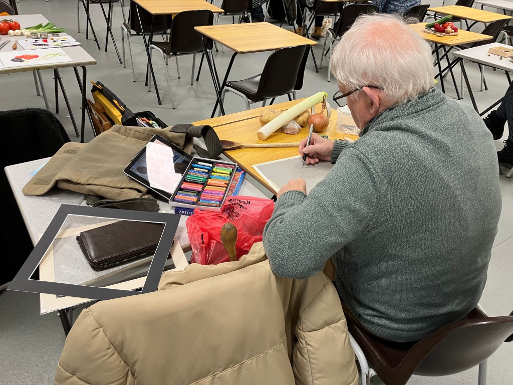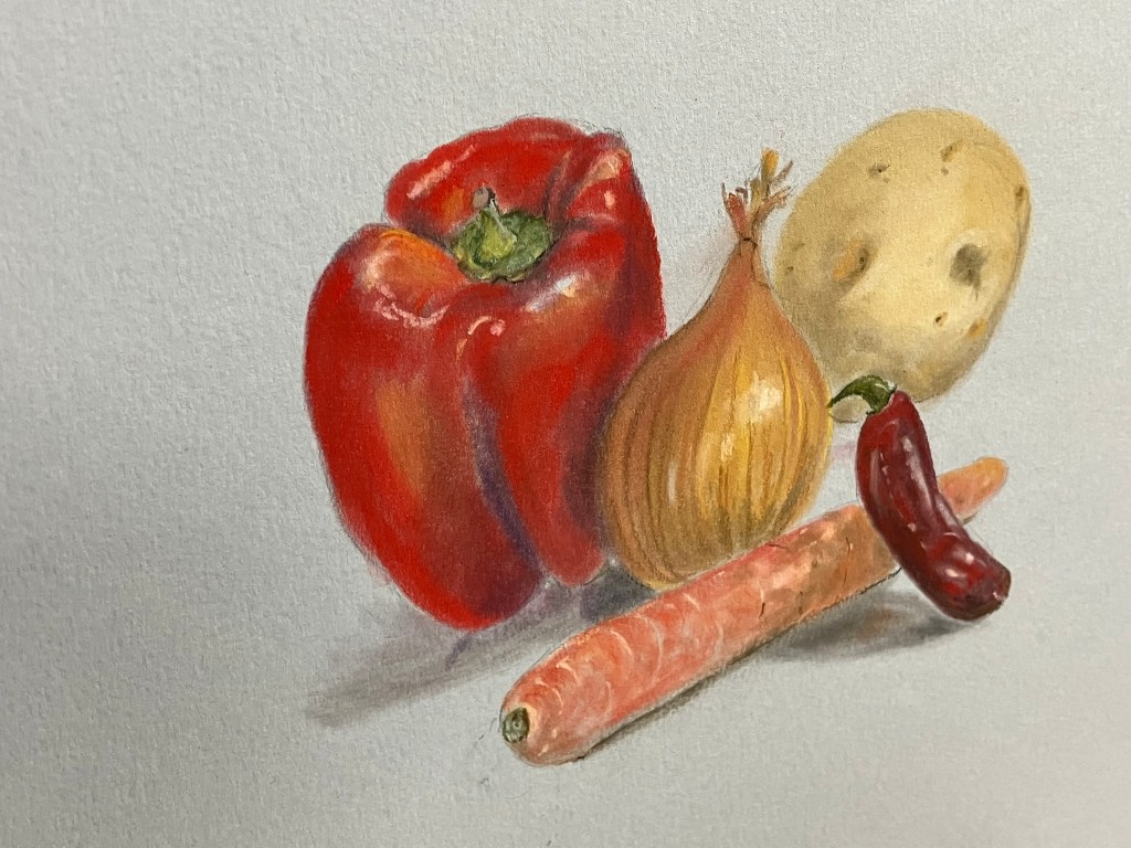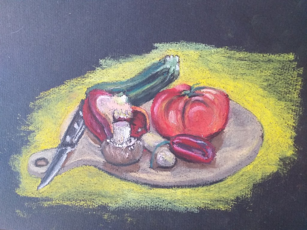 Following a video evening to study various techniques in a range of media, we had a group still life evening where we each bring in some interesting vegetables to paint.