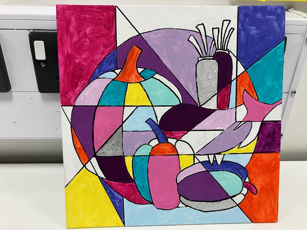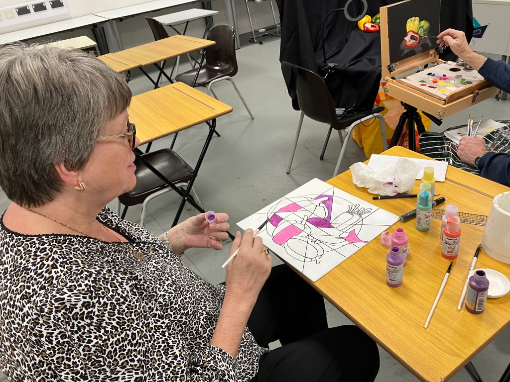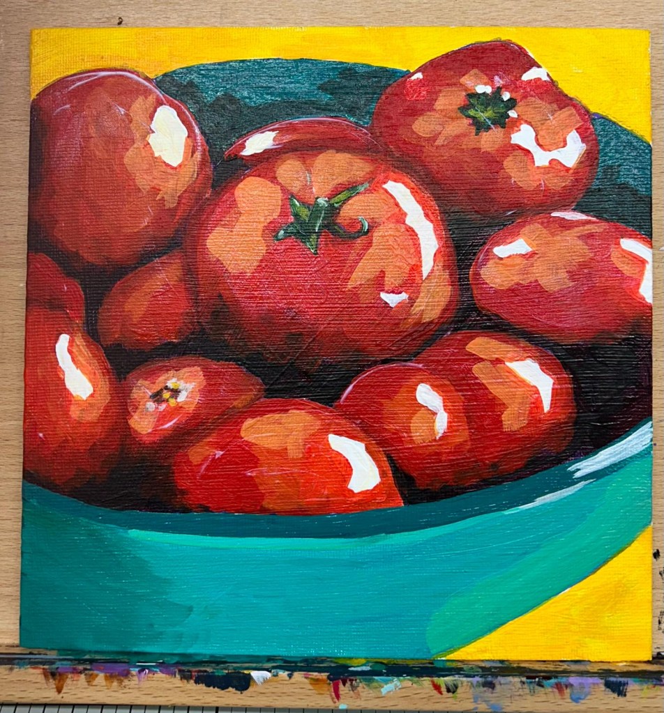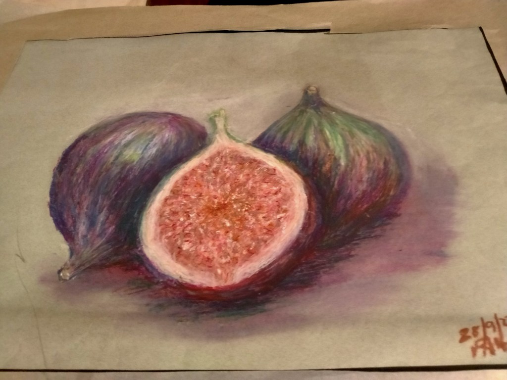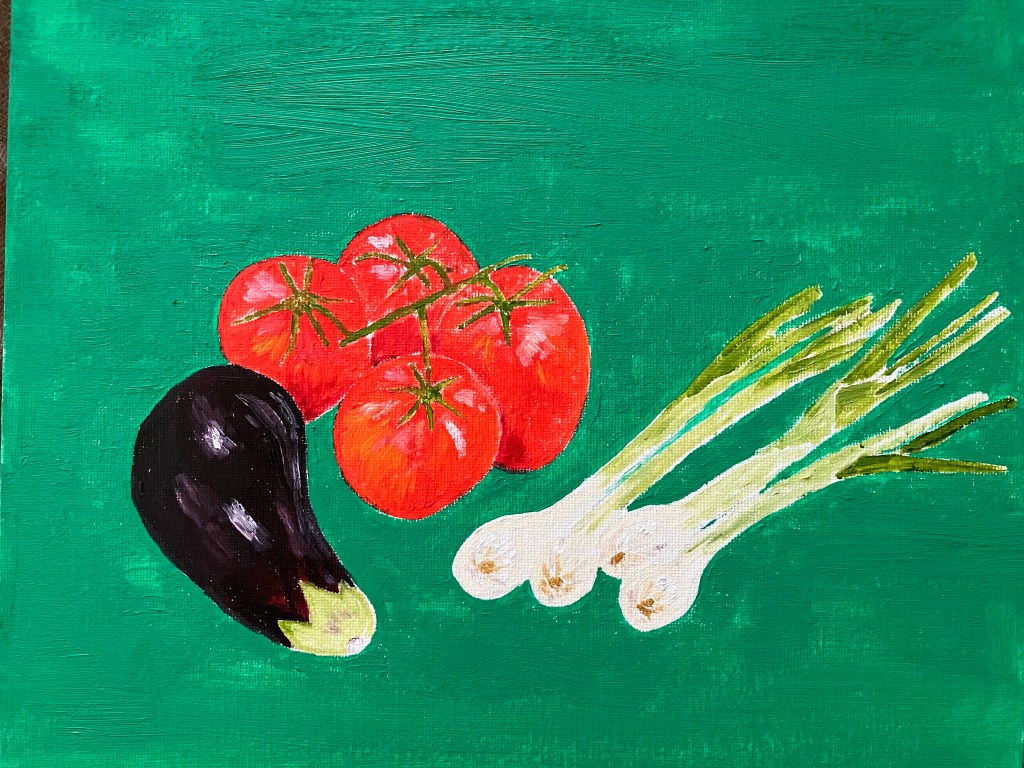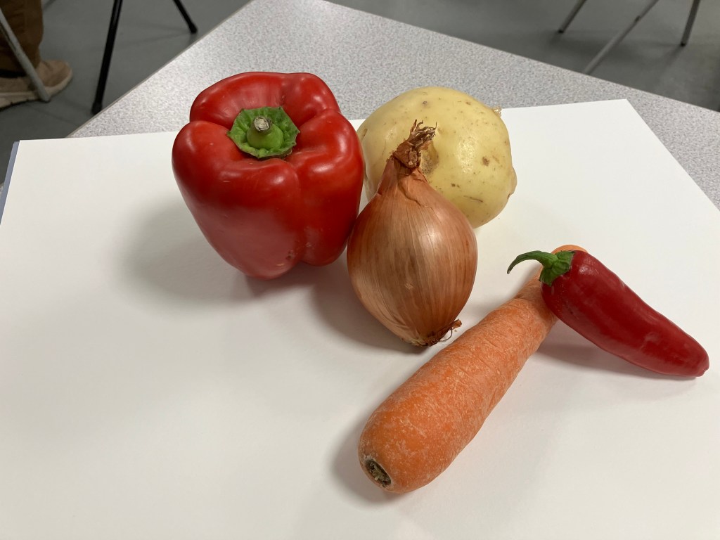 Following a video evening to study various techniques in a range of media, we had a group still life evening where we each bring in some interesting vegetables to paint.